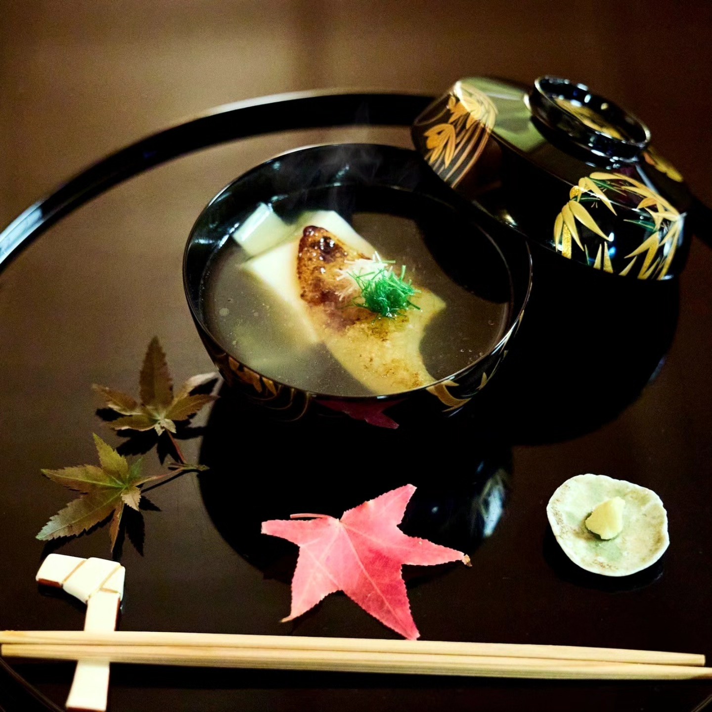 丸汐出汁、焼フカヒレ、胡麻豆腐、針葱、生姜別付