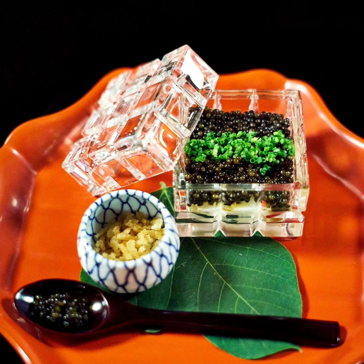✦ うま味キャビア [キューブガラス 八角朱色盆]