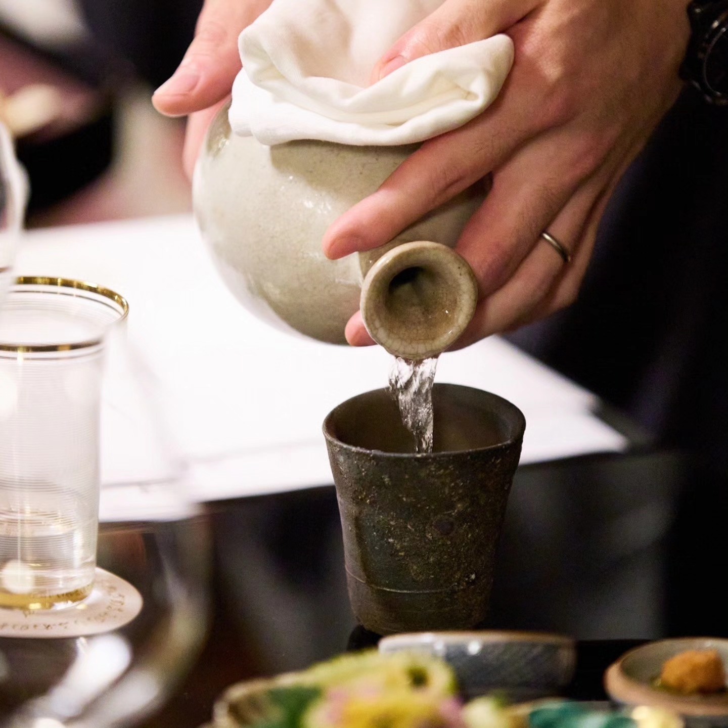 日本酒は、酒器や、飲む温度帯によって味わいや料理との相性も変わり、表情が変化するのが魅力。今回は、最初はキンキンに冷やしてワイングラスで提供し、だんだん温度が上がり、香り・味・テクスチァーの表情が豊かになりました。お向、お椀、造里、にぎり、八寸、松茸焼きを合わせ、後半、60℃の熱燗を、大振りの徳利と筒型の備前杯で提供し、2種類の牛肉を2種の調理方法で仕上げた焚合とペアリングしました。
