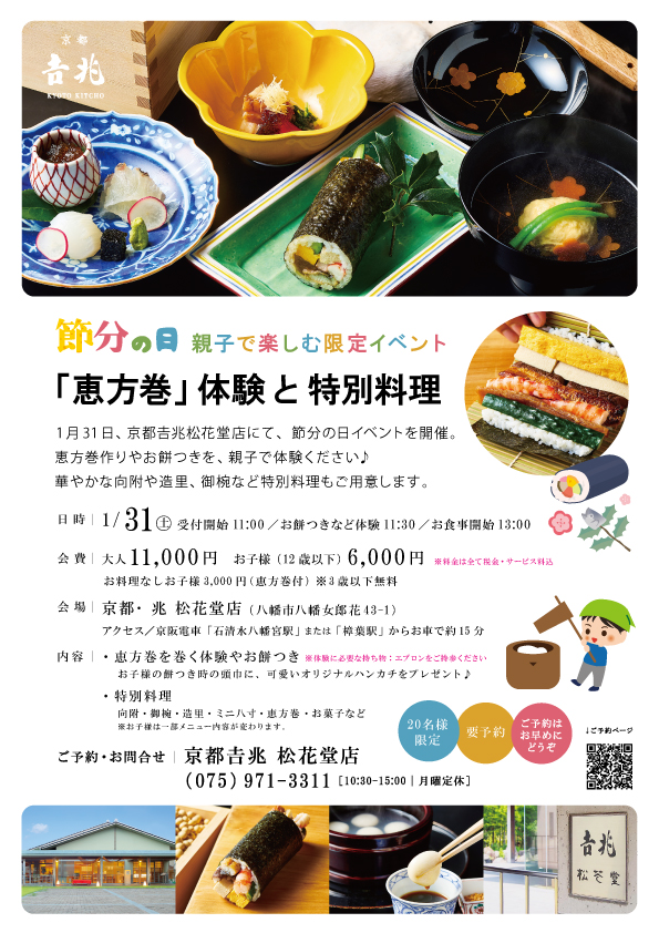 日時 | 1月31日(土) 11:00 受付開始 / 11:30 恵方巻・お餅つき体験 / 13:00 お食事